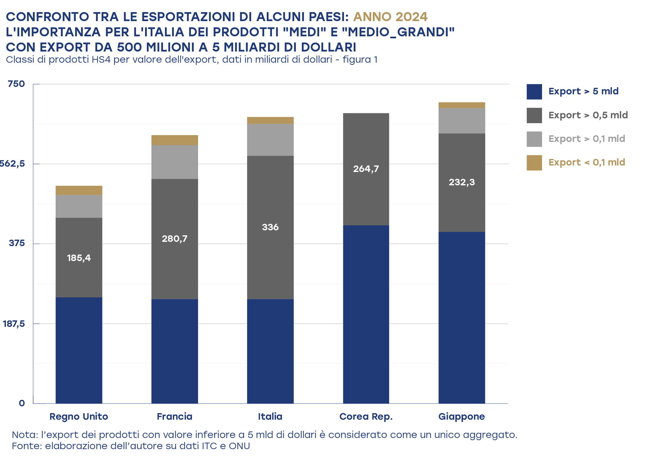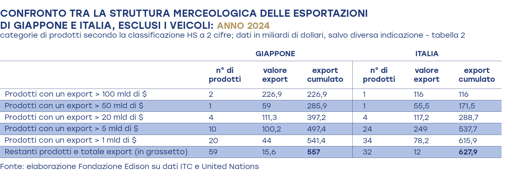 Allargando il confronto con altri Paesi, è interessante notare che, sempre in base alla classificazione HS a due cifre e ai dati del 2024, l’Italia, con i suoi citati 249 miliardi di dollari, è addirittura il terzo esportatore mondiale di prodotti della classe di valore da 5 a 20 miliardi di dollari, appena dietro la Germania (288 miliardi) e gli Stati Uniti (282 miliardi). Il nostro Paese precede la stessa Cina (233 miliardi) e distanzia notevolmente la Francia (168 miliardi) e, oltre al Giappone di cui si è già detto, anche la Corea del Sud (85 miliardi).