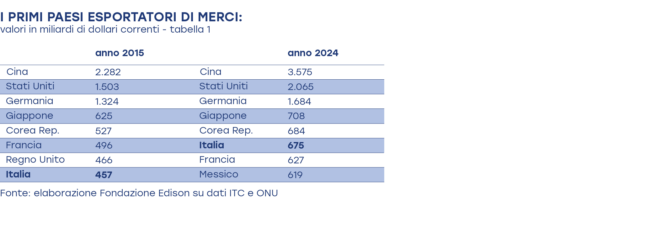 Nonostante il rallentamento del 2023-2024, dovuto alla crisi tedesca e degli scambi intra-europei, negli ultimi dieci anni l’export italiano è stato protagonista di una evoluzione rimarchevole. Infatti, nel 2015 l’Italia era soltanto l’ottavo esportatore mondiale di merci; nel 2024, come si vede dalla tabella 1, si è invece collocata al sesto posto, superando nel frattempo Regno Unito e Francia. Da questa classifica, va precisato, sono esclusi i Paesi Bassi e Hong Kong, che sulla carta ci precedono, ma i cui valori di export sono gonfiati in modo abnorme dai transiti e sono pertanto assolutamente non significativi.